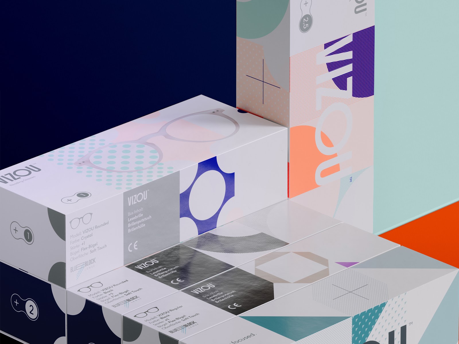 設計師希望表現產品享受每個細節-閱讀的新樂趣這一理念。根據各個眼鏡模型的屈光度,形式和色調而變化,設計師用圖形化的方式加以表達,呈現出與眾不同的視覺效果。