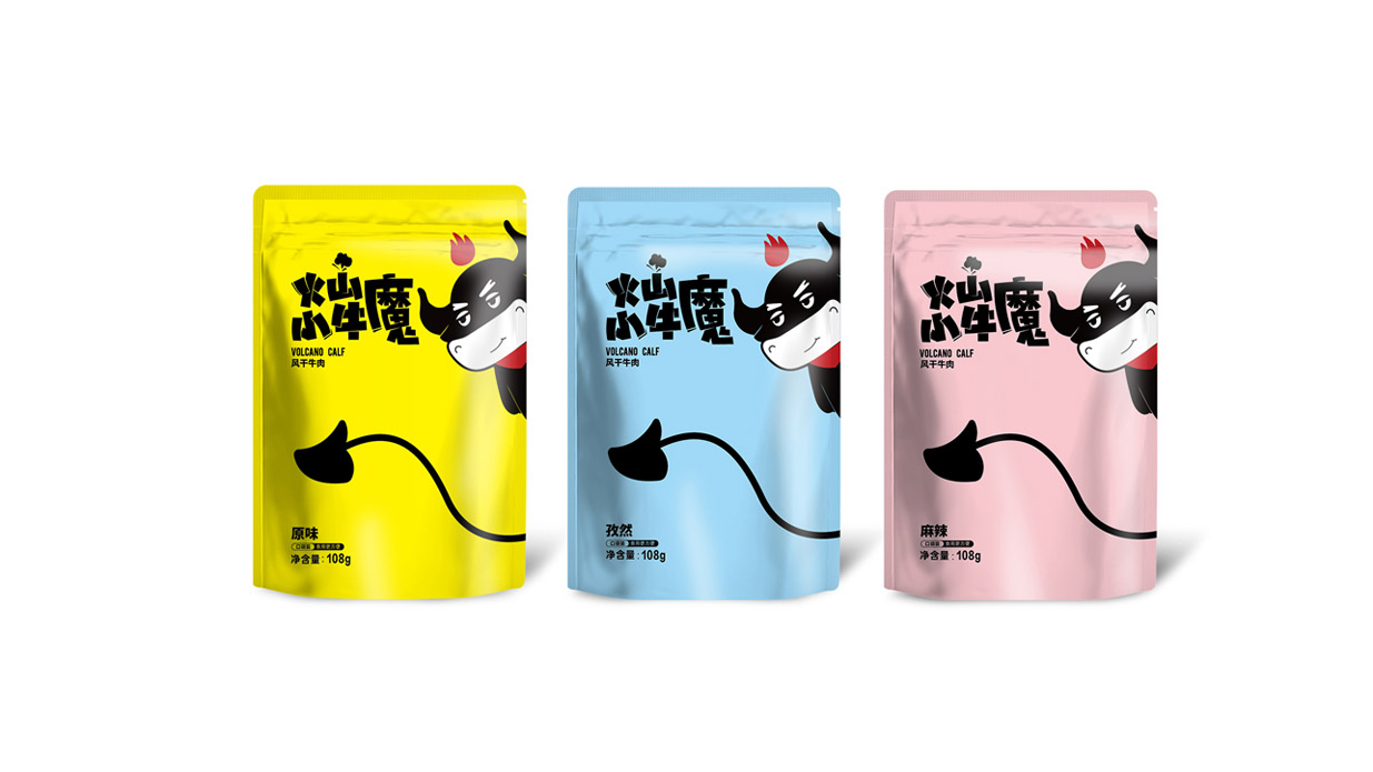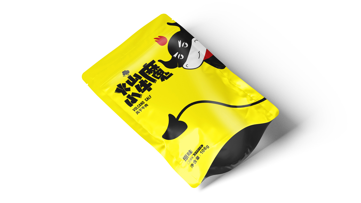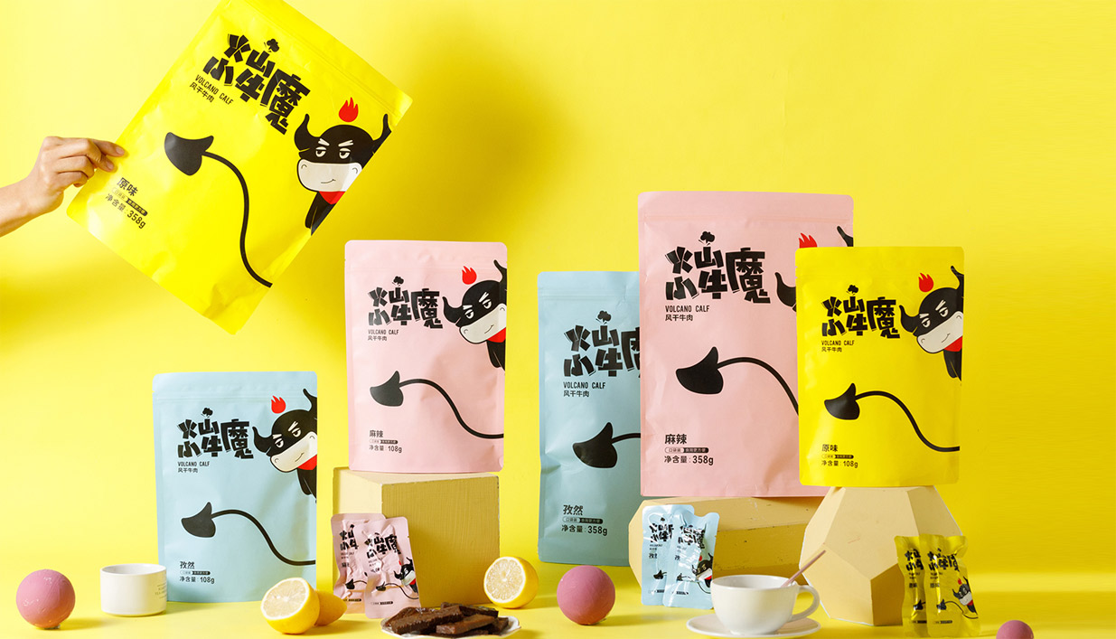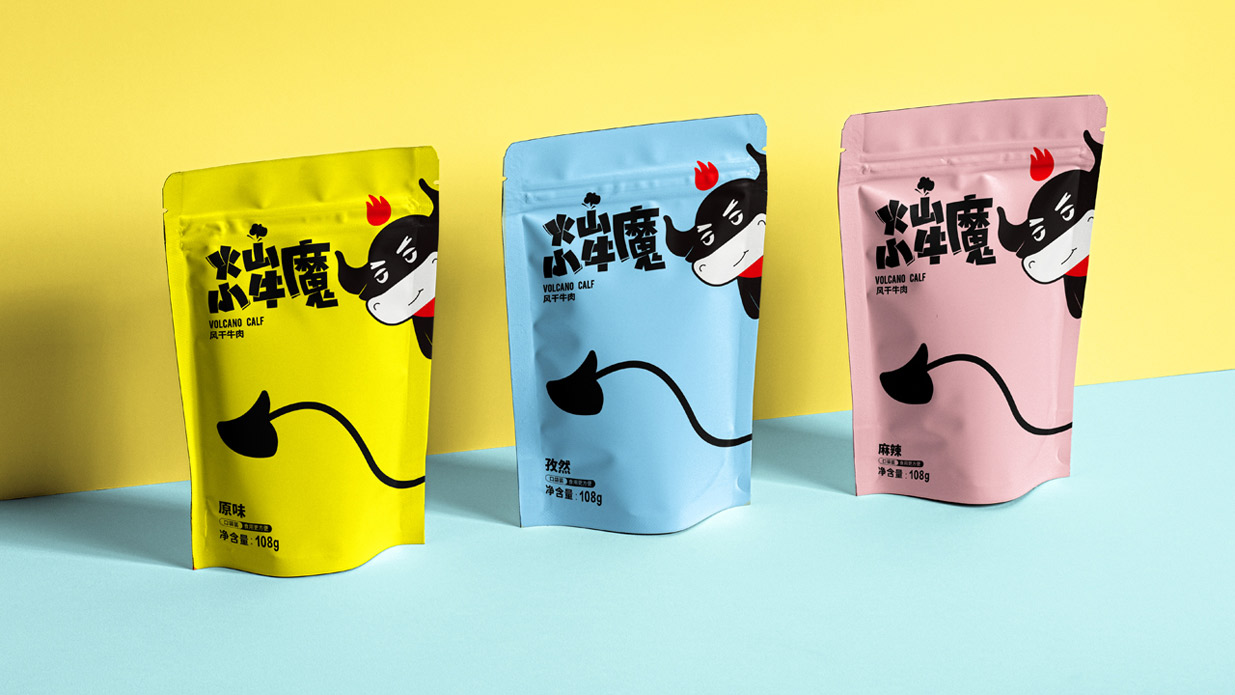Introduction:火山小牛魔是一個牛肉干的品牌,名稱直觀來看,腦海里第一出現的應該是小小Q版牛魔王的造型。有點呆/有點搞怪的性格,考慮到品牌的傳播性,知物設計在造型上盡可能簡約,色彩醒目,更加有利于傳播和記憶。
