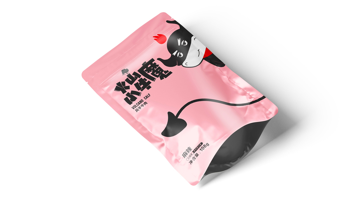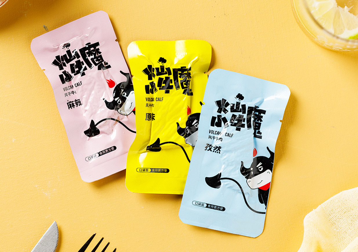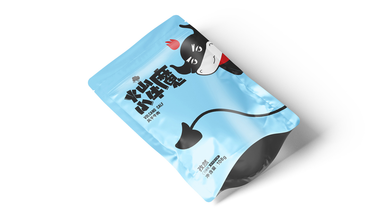 Introduction:火山小牛魔是一個牛肉干的品牌,名稱直觀來看,腦海里第一出現的應該是小小Q版牛魔王的造型。有點呆/有點搞怪的性格,考慮到品牌的傳播性,知物設計在造型上盡可能簡約,色彩醒目,更加有利于傳播和記憶。